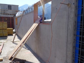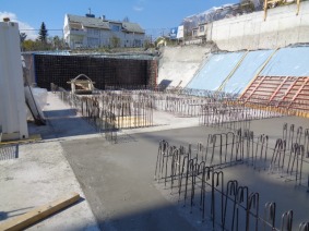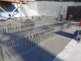 Mittlerweile wurde bereits die letzte Etappe der Bodenplatte und weitere Wände des Untergeschosses betoniert sowie ein Teil der Aussenwände ausgeschalt. Die Positionen der Kellerwände sind anhand der Bewehrungseisen, welche aus der Bodenplatte herausragen, ersichtlich.