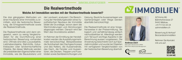 Die drei gängisten Methoden um einen Kaufpreis einer Immobilie zu ermitteln, sind die hedonische Bewertung, die Ertragswertmethode sowie die Realwertmethode. Die Realwertmethode wird dann eingesetzt, wenn zu wenig Vergleichsdaten für die Durchführung einer hedonischen Bewertung vorhanden sind. Oftmals sind dies Luxusobjekte, Liebhaberobjekte, Bahnhöfe, Industriebauten oder landwirtschaftliche Objekte. Bei dieser Methode werden die preisbildenden Eigenschaften einer Immobilie, wie die Bausubstanz und der Landwert, analysiert. Die Berechnung der Herstellungskosten eines hypothetischen Neubaus der Immobilie bildet die Grundlage, wovon dann die Wertminderungen und Abnützungen abgezogen werden. Danach wird der Wert des Grundstücks addiert. Im Rahmen der Ermittlung der Herstellkosten werden die Ausstattungsmerkmale berücksichtigt. Beispielsweise die Nutzbarkeit des Dachgeschosses und des Kellers, die Aussenwände, das Dach, die Fenster und Aussentüren, die Decken, Treppen und Fussböden sowie Sanitäreinrichtungen und Heizung. Bauliche Aussenanlagen wie Gartenanlagen oder Wege werden ebenfalls berücksichtigt. Die Realwertmethode ist eine Vorgehensweise in der Preisermittlung, die logisch und verhältnismässig einfach nachvollziehbar ist. Allerdings werden zum Teil auch wichtige Aspekte in der Berechnung aussen vorgelassen. Die Anwendung beschränkt sich auf Spezialimmobilien und wurde bei Objekten mit verfügbaren Vergleichsdaten von der hedonischen Bewertung überholt.